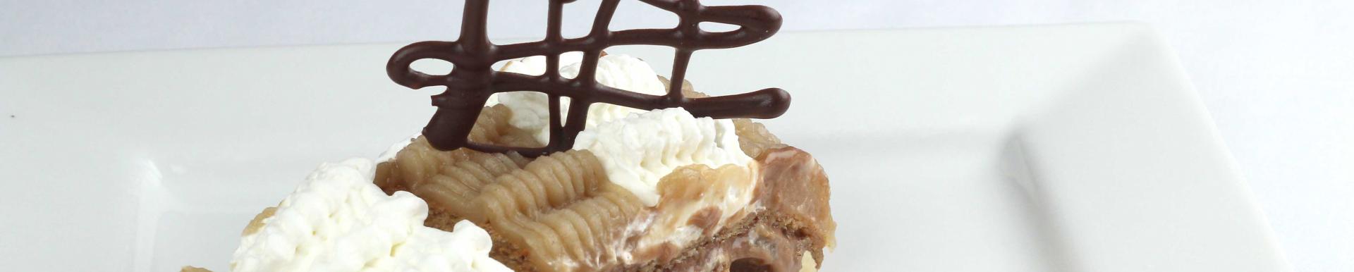 Montage : Imbiber les biscuits avec le sirop de poires. Étaler la moitié de la crème de marrons sur le biscuit et y déposer des morceaux de poires pochées .