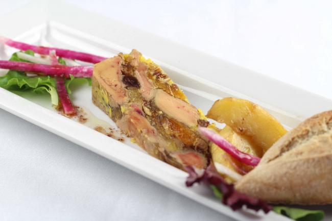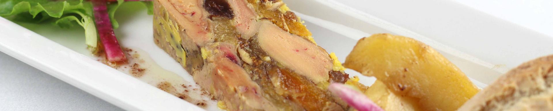 Montez une couche de foie gras et une couche de fruits dans une petite terrine tapissée de film étirable. Finissez par une couche de foie. Tassez bien, rabattez le film sur le dessus et mettez au frais une nuit minimum.
