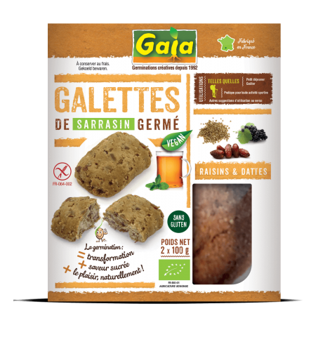 Galettes de céréales germées sucrées aux fruits secs (raisins, figues, dattes, bananes, multigrains) ou salées aux légumineuses germées (lentilles, haricots blancs, haricots mungos, pois chiches) et galettes sans gluten au sarrasin germé (raisins & dattes, spiruline, choco, pois chiches & cumin)